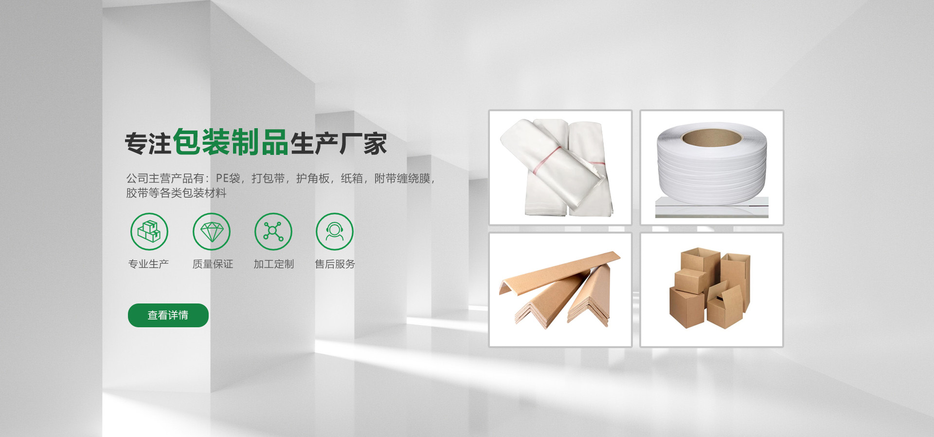 专业生产PE袋,打包带,护角板,纸箱,附带缠绕膜,胶带等各类包装材料